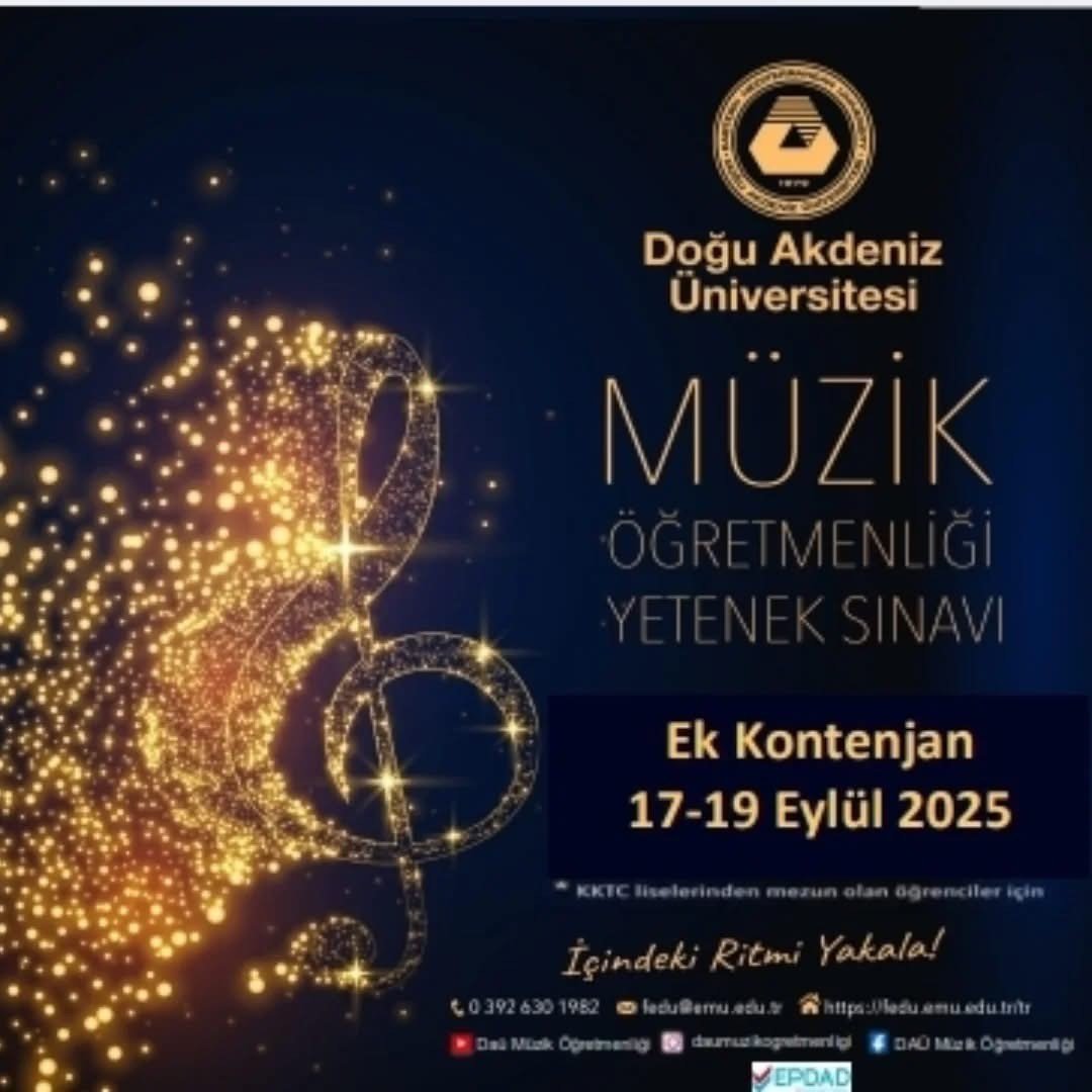 Doğu Akdeniz Üniversitesi (DAÜ) Eğitim Fakültesi, Güzel Sanatlar Eğitimi Bölümü tarafından Müzik Öğretmenliği Lisans Programı için ek kontenjan yetenek sınavı yapılacak.
