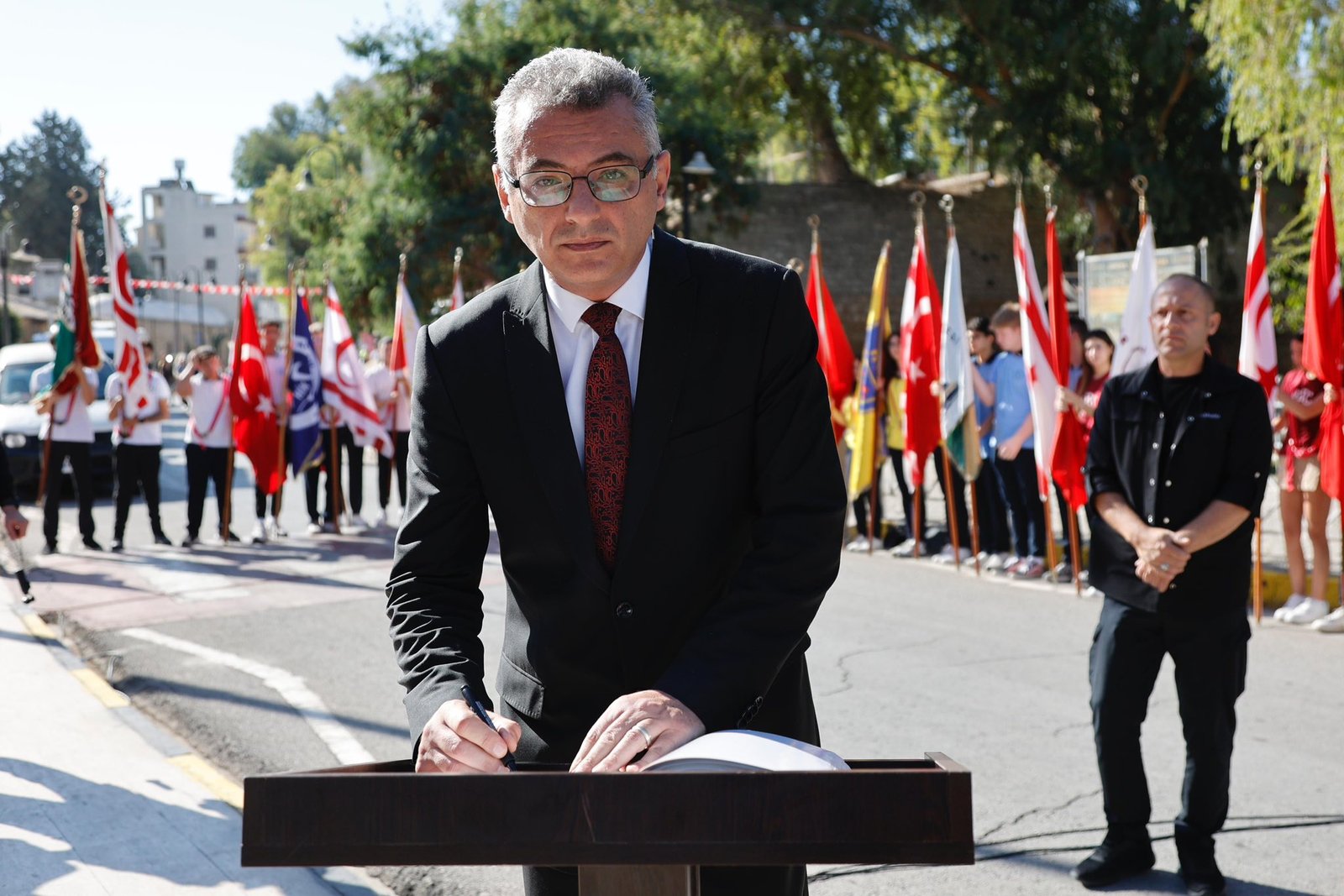 Cumhurbaşkanı Tufan Erhürman ve Türkiye Cumhuriyeti Lefkoşa Büyükelçisi Ali Murat Başçeri’nin Anıt Özel Defterini imzalamasıyla tören sona erdi.