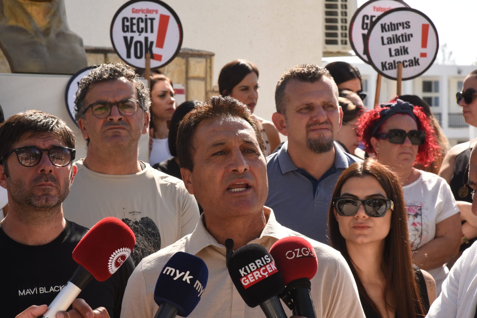Eylemde, “İrademize sahip çıkıyoruz. Dayatmalara, yoksullaştırmaya, gericiliğe geçit yok”, “Kız çocuklarını istismar eden siyasal İslam’a izin vermeyeceğiz” yazılı pankartları açıldı; “Kıbrıs laiktir, laik kalacak”, “Geçit yok”, “Etişir”, “Tayfaldık” yazılı dövizler taşındı.