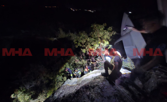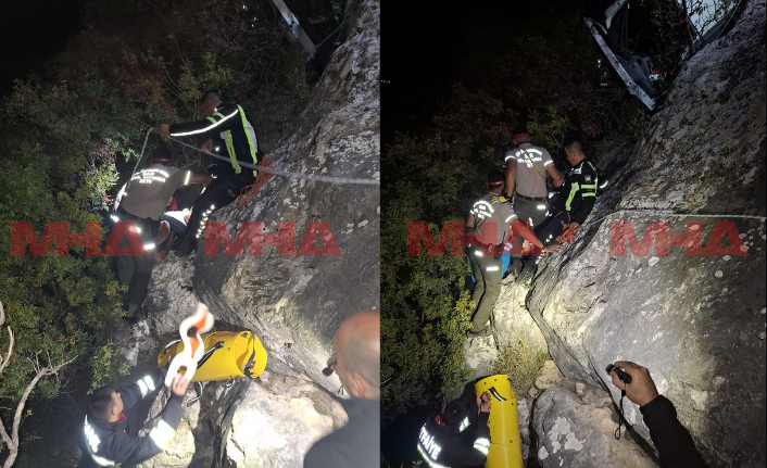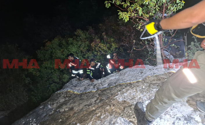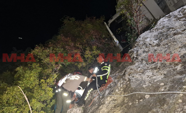 Ekipler tarafından yapılan kurtarma çalışması sonucu sürücü, travma sedyesine sabitlenerek yukarı alınıyor.